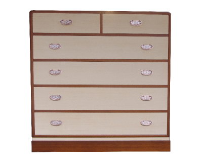 以前大ヒットした森シリーズ(当作品の原型で同じ仕上げの4重チェスト)の改良発展型で更にスケールアップと品質向上を目指し、成品化したチェストで、洋間に品良く設置出来る秀れ物です。当チェストは、数々の特長がありますが、そのひとつに新潟津南産の優良桐を全てに用いていることも大きなセールスポイントです。