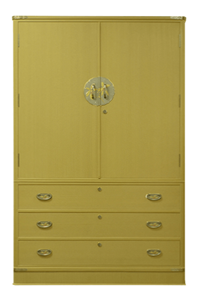 胴丸というのは、桐たんすの保立(たんすに向かって本体左右の縦の柱部分を指しますが40mmの厚さで曲面に加工している形を呼びますが、本来は中京や関西は発生の地です。現在、その肉厚や迫力、豪華さに於いて桐たんすの中でも最上位にランクされる胴丸を伝統工芸士横山松雄が丹精込めて作りました。材料は新潟津南桐を使い、柾材は会津産に匹敵する北米の特上柾を吟味して用いております。胴丸衣裳たんすで金具はあおきです。